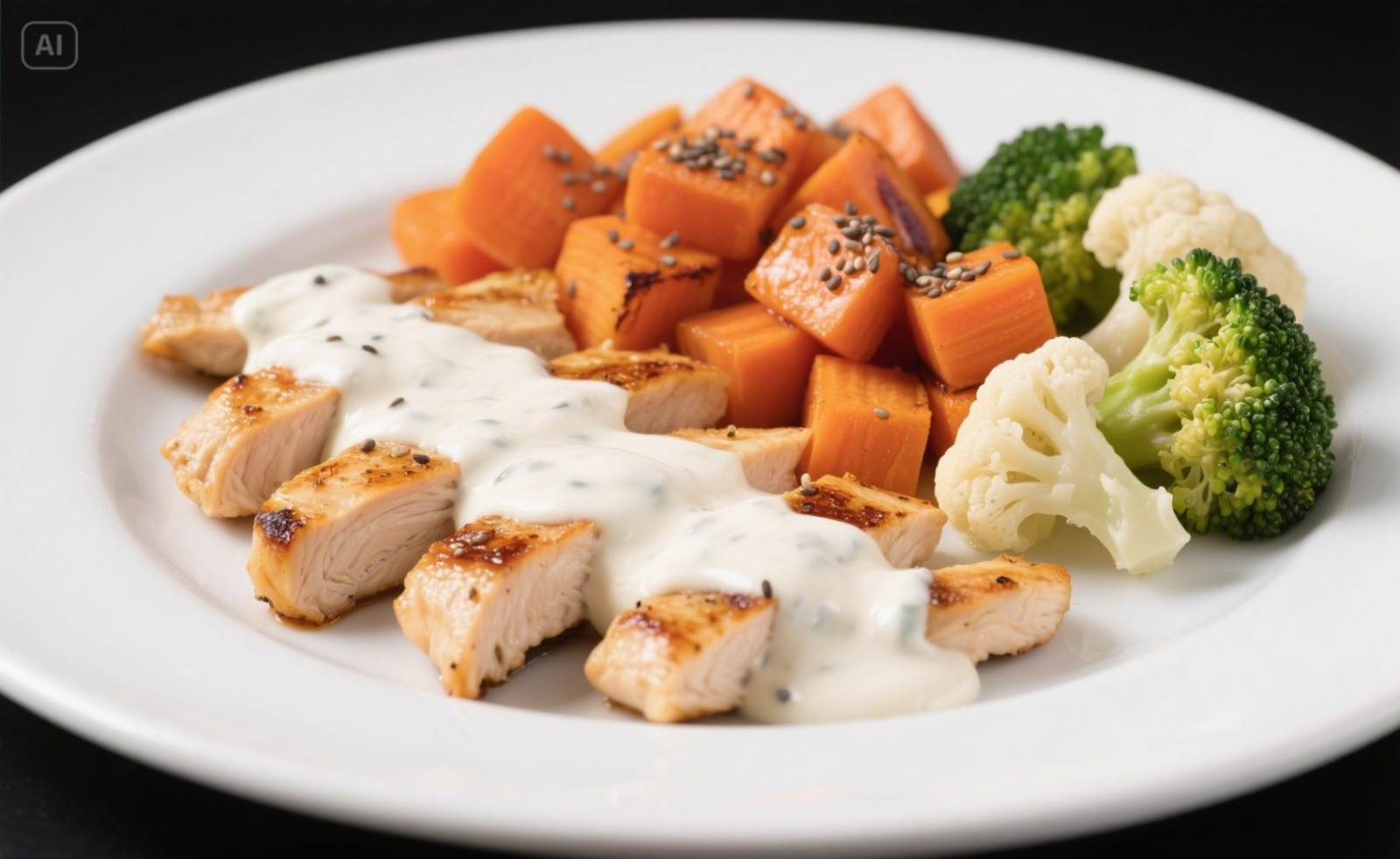 Descrição: Frango grelhado com molho siciliano funcional, servido com um mix de legumes com chia. Ideal para uma refeição leve e cheia de sabor, perfeita para manter a dieta low carb.